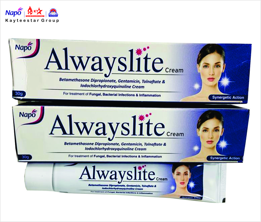 February 13, 2025 ALWAYSLITE CREAM 30GM Product Code AP000107 Pack Size 30 GM Tube Dosage Derma Composition Betamethasone Dipropionate USP (0.643 mg) + Gentamicin Sulphate BP Equivalent to Gentamicinbase (1 mg) + Tolnaftate USP (10 mg) + Iodochlorhydroxyquinoline (In House) (10 mg),(QS) Cream SKU: AP000107 Category: Derma Related products KETOKREM CREAM Read more TRIDERMIX CREAM Read more NAPO FEVICLEAR CREAM Read more NAPO NOPILE OINTMENT Read more