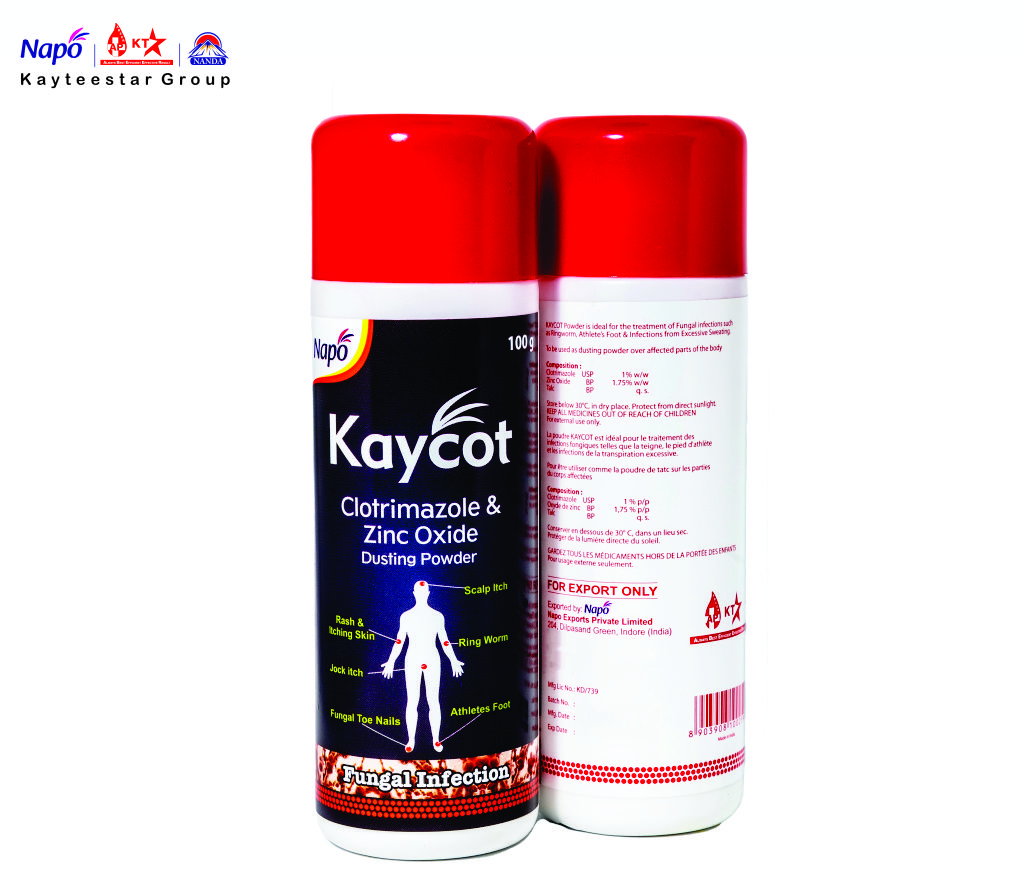 February 13, 2025 KAYCOT POWDER (GVCL) Product Code AP000353 Pack Size 100 GM Dosage Consumer Goods Composition Clotrimazole USP 1% w/w, Zinc Oxide BP 1.75% w/w, Talc BP q.s. SKU: AP000353 Category: Consumer Goods Related products NAPO CHEST RUB 10 ML Read more 25 PULL PACK ICEBERG WET WIPES Read more NAPO CASTOR OIL BP Read more NAPO LOZENGES 3.3 gm Menthol Read more