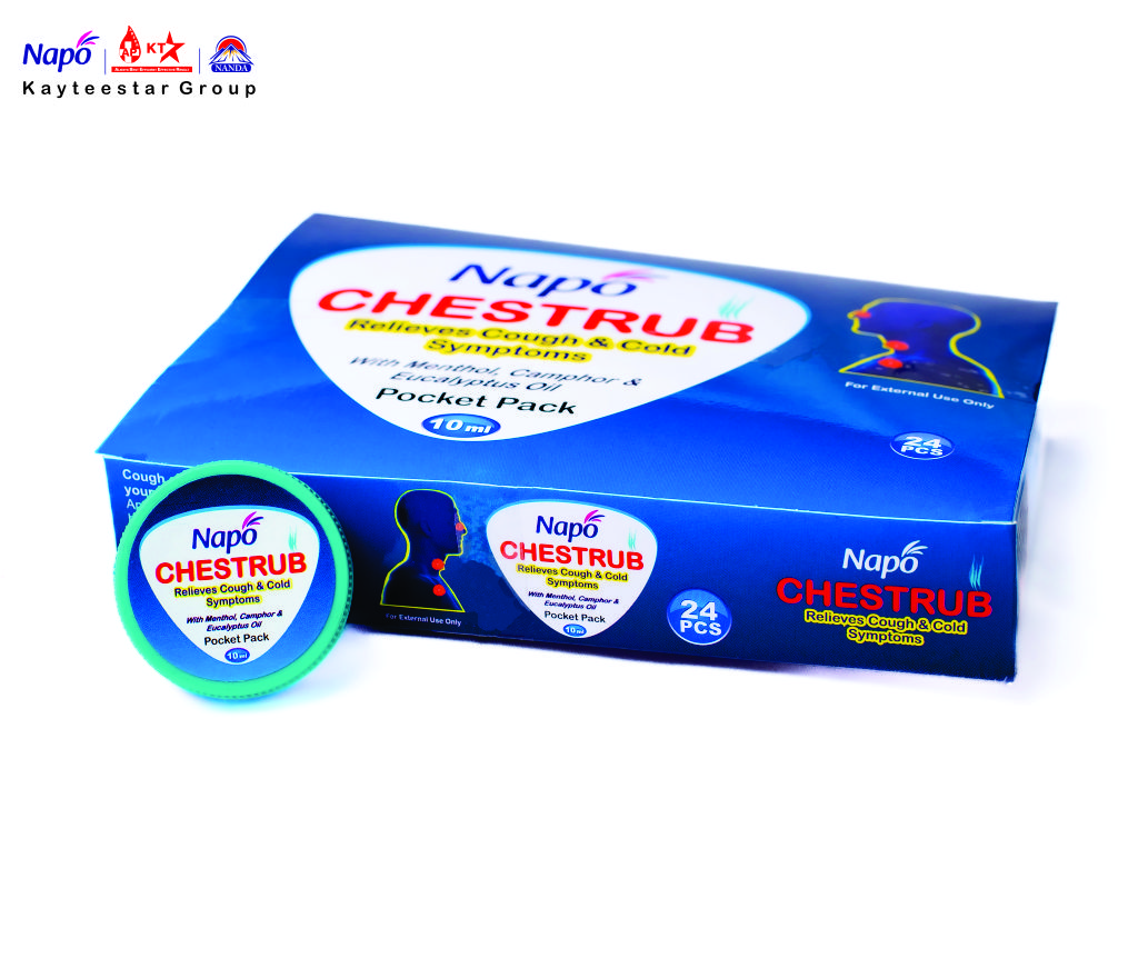 February 13, 2025 NAPO CHEST RUB 10 ML Product Code AP000055 Pack Size 1 x 24 Jar Dosage Consumer Goods Composition Menthol-4% , Camphor-6% , Eucalyptus Oil-6% , Base-q.s. SKU: AP000055 Category: Consumer Goods Related products 25 PULL PACK ICEBERG WET WIPES Read more NAPO CASTOR OIL BP Read more SCEPTRE ORGANICS BABY WIPES Read more ENO FRUIT SALT (SACHETS) Read more