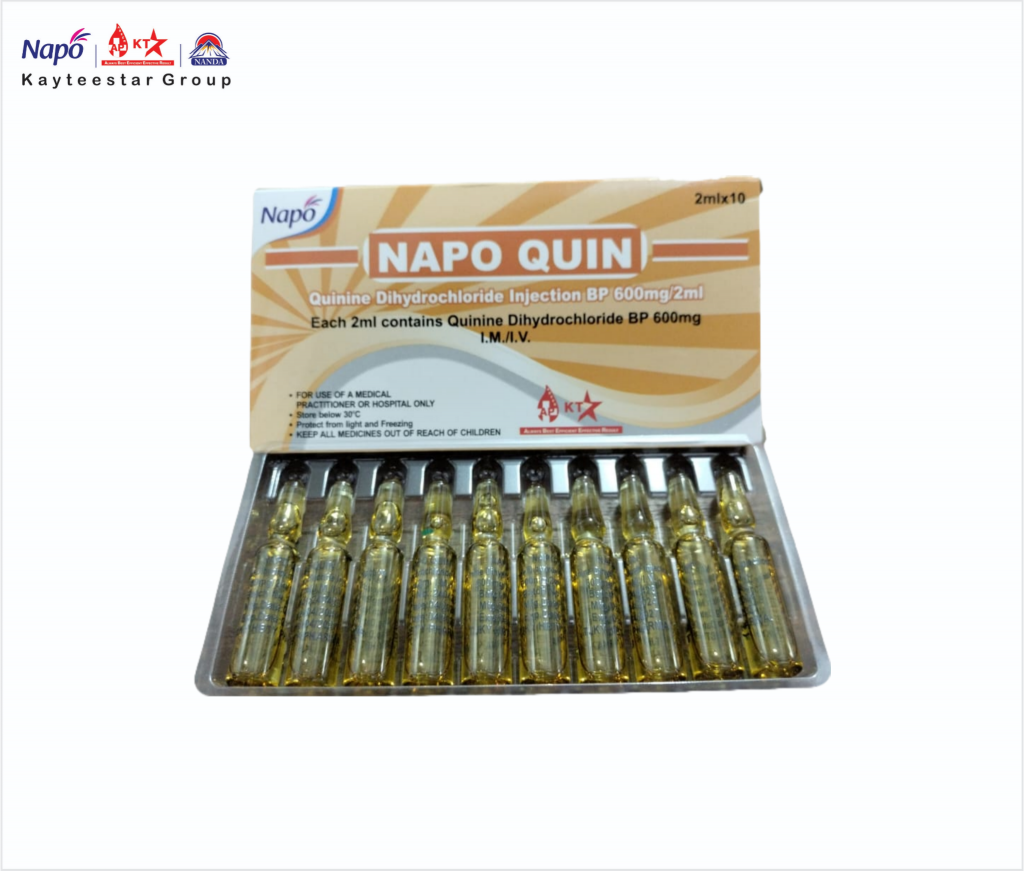 April 19, 2025 NAPO QUIN INJECTION Product Code AP000480 Pack Size 2 ML X 10 Dosage INJECTION Composition Each 2 ml Contains : Quinine Dihydrochloride BP 600 mg SKU: AP000480 Category: Injection Related products STERILE WATER FOR INJECTION BP Read more NAPOCORT INJECTION B.P 40 MG/ML Read more PROPOFOL INJECTION Read more ONDEKAM INJECTION Read more