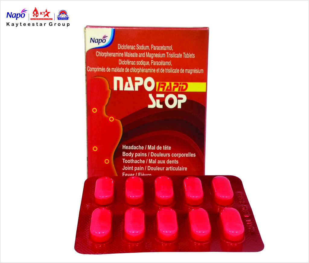 April 11, 2025 NAPO RAPID STOP TABLETS Product Code AP000297 Pack Size 50 x 1 x 10 T Dosage Tablets Composition Each Uncoated tablet contains : Diclofenace Sodium BP 50 mg (As enteric coated granules) , Paracetamol BP 325 mg , Chlorphenamine Maleate BP 4 mg , Magnesium SKU: AP000297 Category: Tablets Related products CEFINE-400 TABLET Read more FAVIMAX 400MG TABLETS Read more CEFINE 200 TABLETS Read more KILLMAL KID 20/120 TABLET Read more